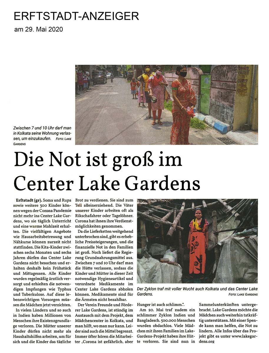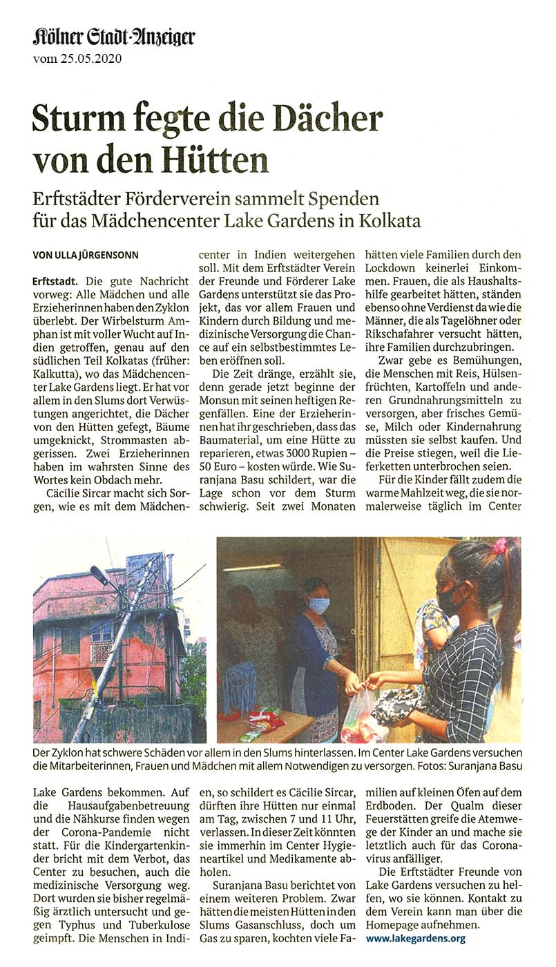 Der Kölner Stadtanzeiger vom 25.05.2020 und der Erftstadt-Anzeiger vom 29.05.2020 haben Berichte über unser Mädchencenter in Kolkata veröffentlicht. Neben der von der Corona-Einschränkungen ausgehenden Auswirkungen fegte am 20.05.2020 auch noch ein verheerender Zyklon über die Region Indien und Bangladesch hinweg. 500.000 Menschen wurden obdachlos.