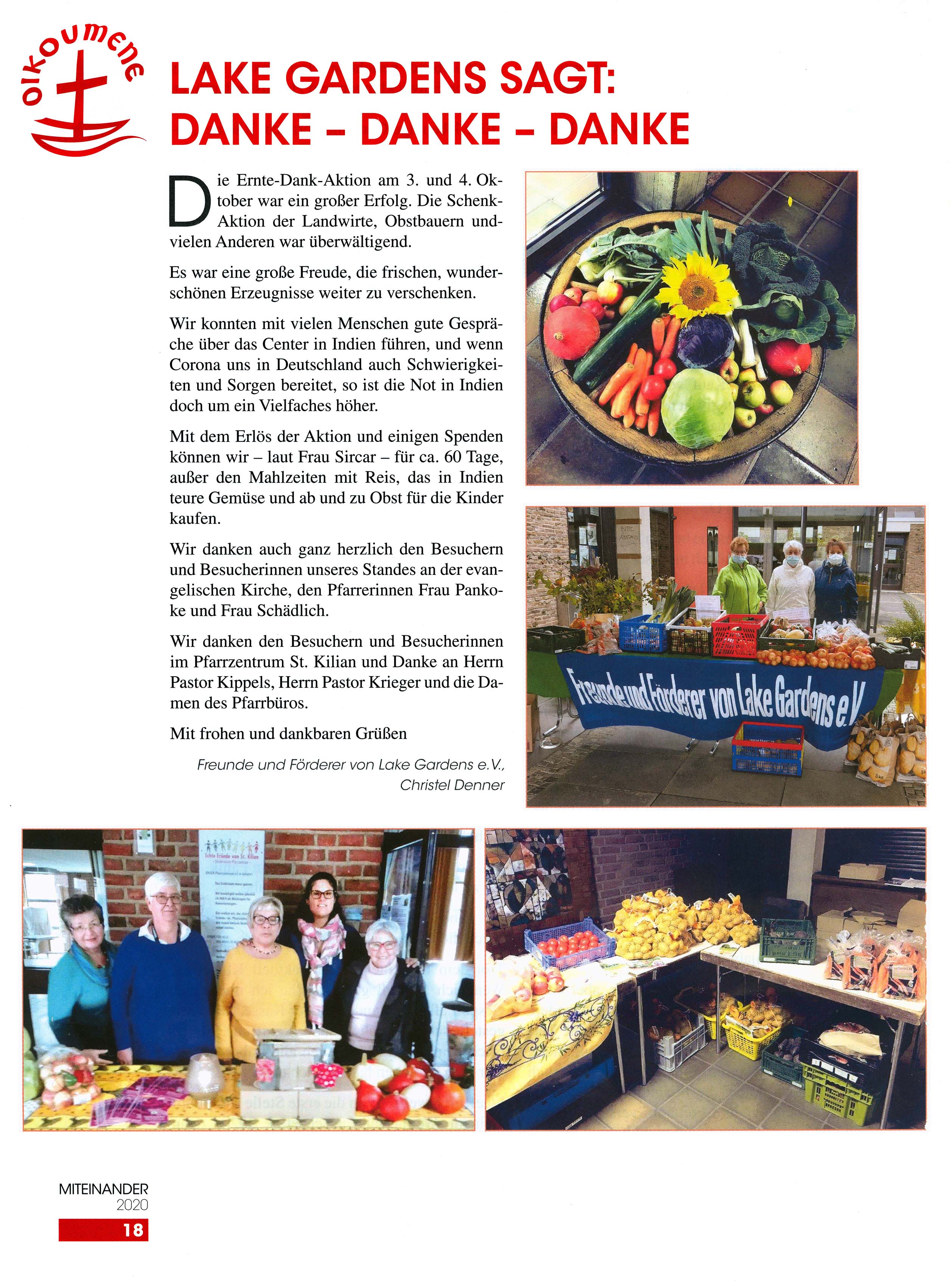 Am 03. und 04. Oktober 2020 hat der Verein "Freunde und Förderer Lake Gardens e. V." eine Aktion anlässlich des Ernte-Dank-Festes vor den Kirchen in Lechenich gestartet. Landwirte und Obstbauern spendeten Obst für diesen guten Zweck, das an Ständen gegen eine Spende erhältlich war. Den Bericht in der "Informiert" der evangelischen und katholischen Kirche finden Sie hier.